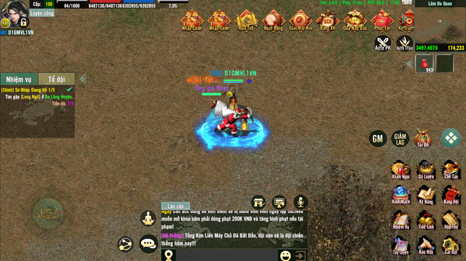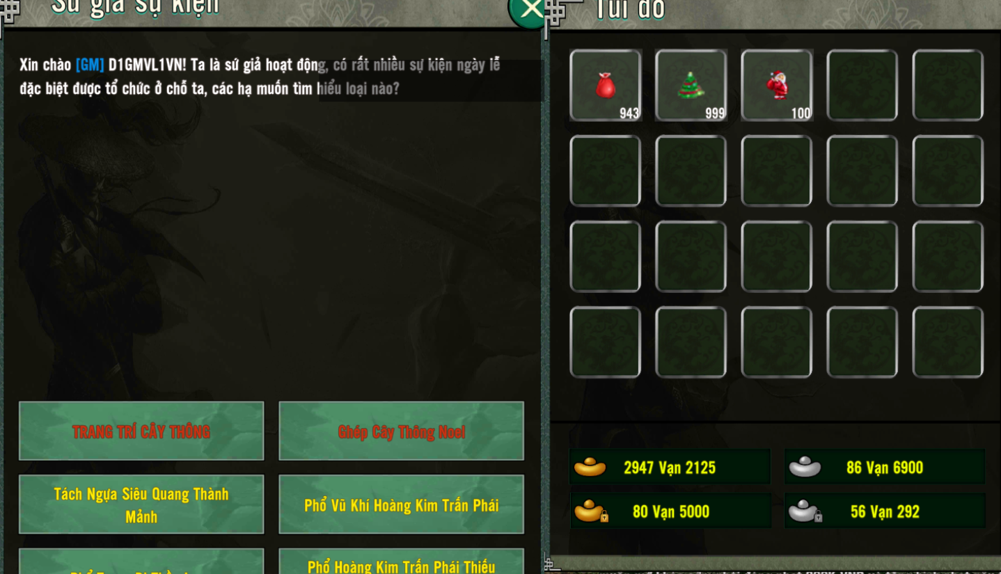 • Trong thời gian diễn ra sự kiện sử dụng “Túi Giáng Sinh” có tỉ lệ nhận được “Ông Già Noel” đem đến NPC Sứ Giả Sự Kiện đổi nhận CÂY THÔNG NOEL sử dụng nhận rất nhiều EXP tùy theo cụm server. Mỗi ngày tối đa sử dụng 6 lần.