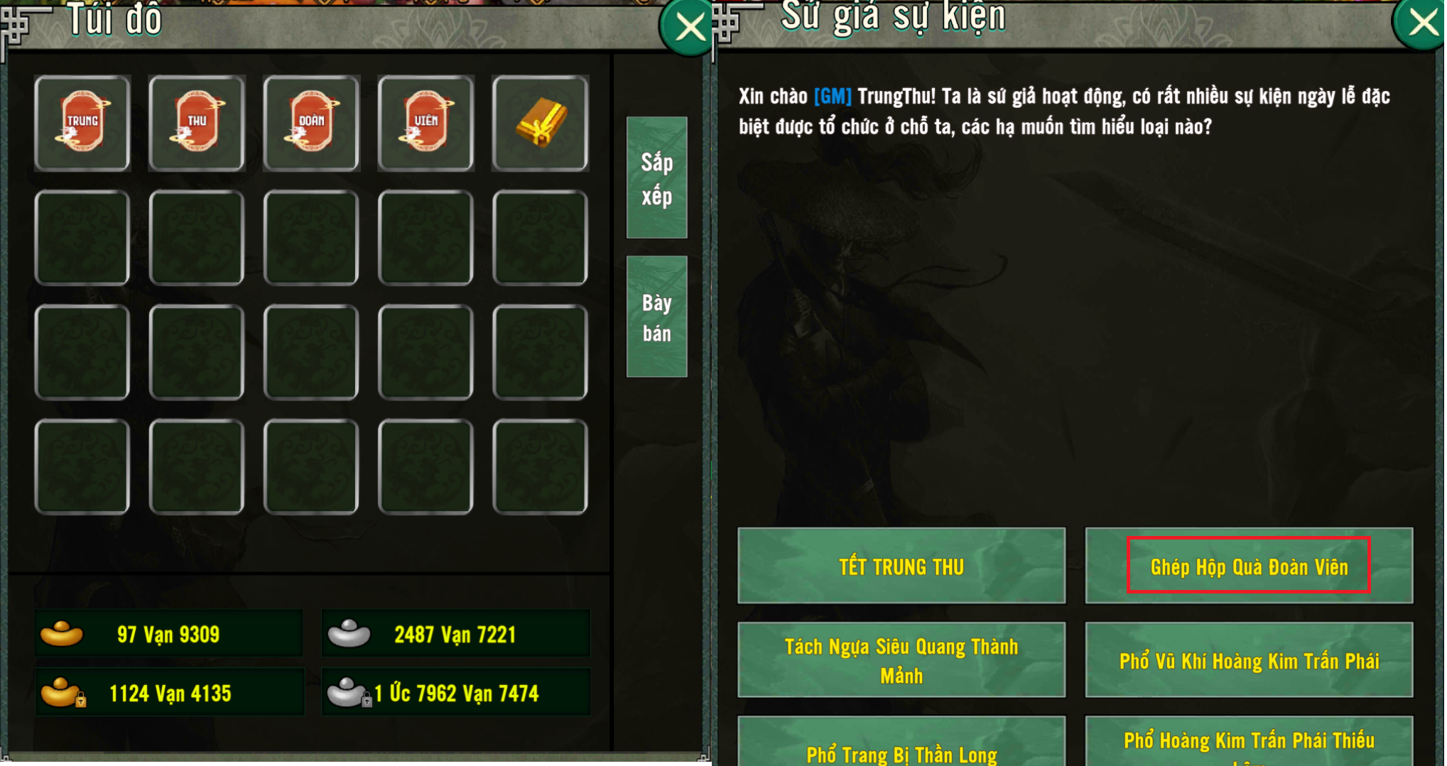 • Trong thời gian diễn ra sự kiện tiêu diệt quái dã ngoại có tỉ lệ thấp nhận “Trung”, “Thu”, “Đoàn”, “Viên” . Sau khi đủ 4 chữ mang đến NPC Sứ Giả Sự Kiện ghép nhận HỘP QUÀ ĐOÀN VIÊN sử dụng nhận rất nhiều EXP tùy theo cụm server. Mỗi ngày tối đa sử dụng 6 lần.