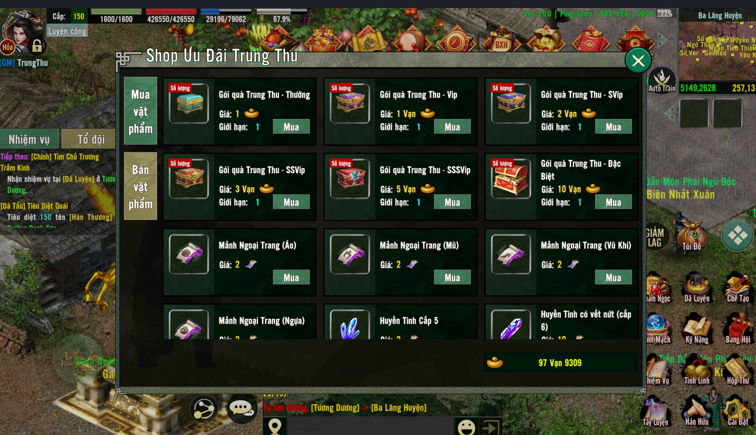 ❖ Bánh Trung Thu : Sử dụng nhận ngẫu nhiên các vật phẩm : Chân Nguyên, Kinh Mạch Đan, Mảnh ngoại trang áo, mũ, Tỉ lệ thấp nhận mãnh luyện hóa ngựa - siêu quang.Ngũ Hành Thạch, Bạc, Huyền Tinh Cấp 4,5,6,7 Kinh Nghiệm, Tinh Hoạt Lực, Túi CTC, Lệnh Bài Liên Đấu, Lệnh Bài PHLT, Trang Bị Động Sát, Mảnh Luyện Hóa Ấn, Huyết Ngọc, Hòa Thị Ngọc. Tối đa sử dụng 150 lần/nhân vật.